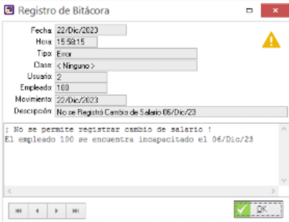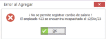El sistema bloquea el movimiento cuando se intenta modificar el salario de un empleado incapacitado, eliminando la necesidad de correcciones manuales.