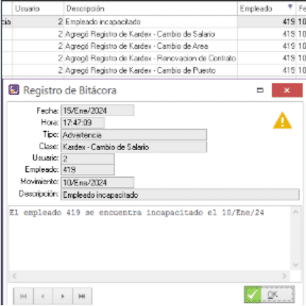 El sistema genera una alerta en la bitácora para los empleados excluidos por incapacidad.